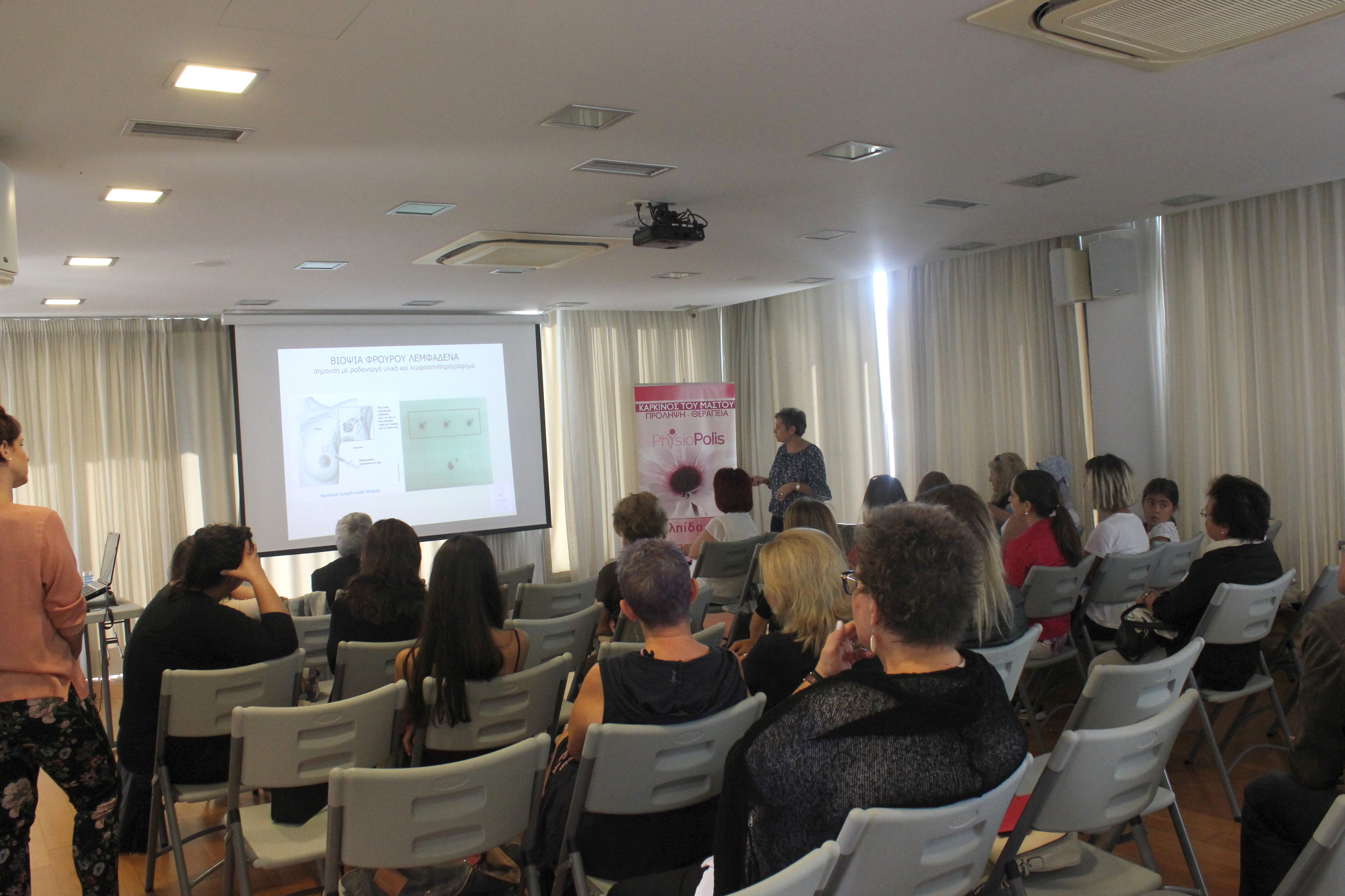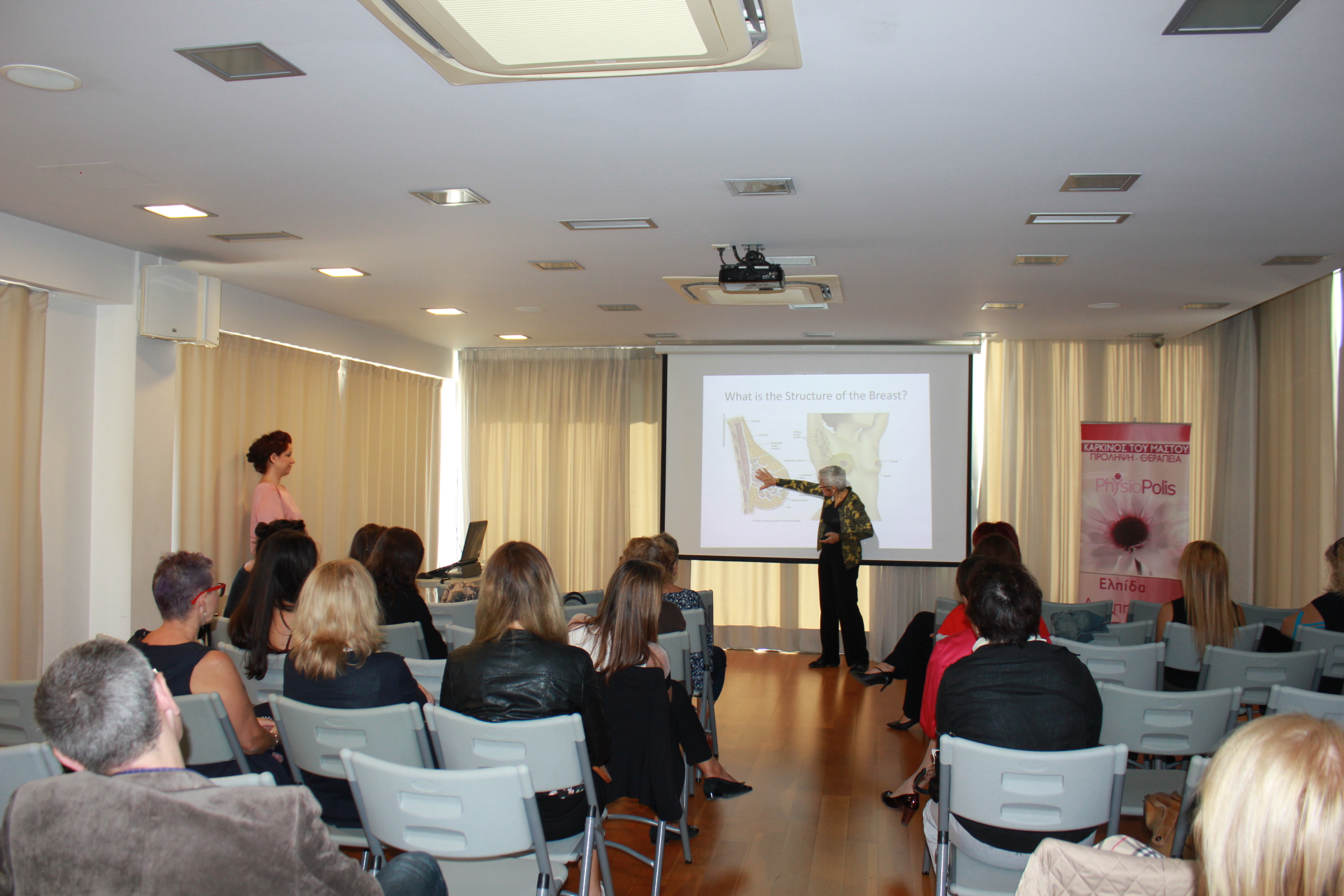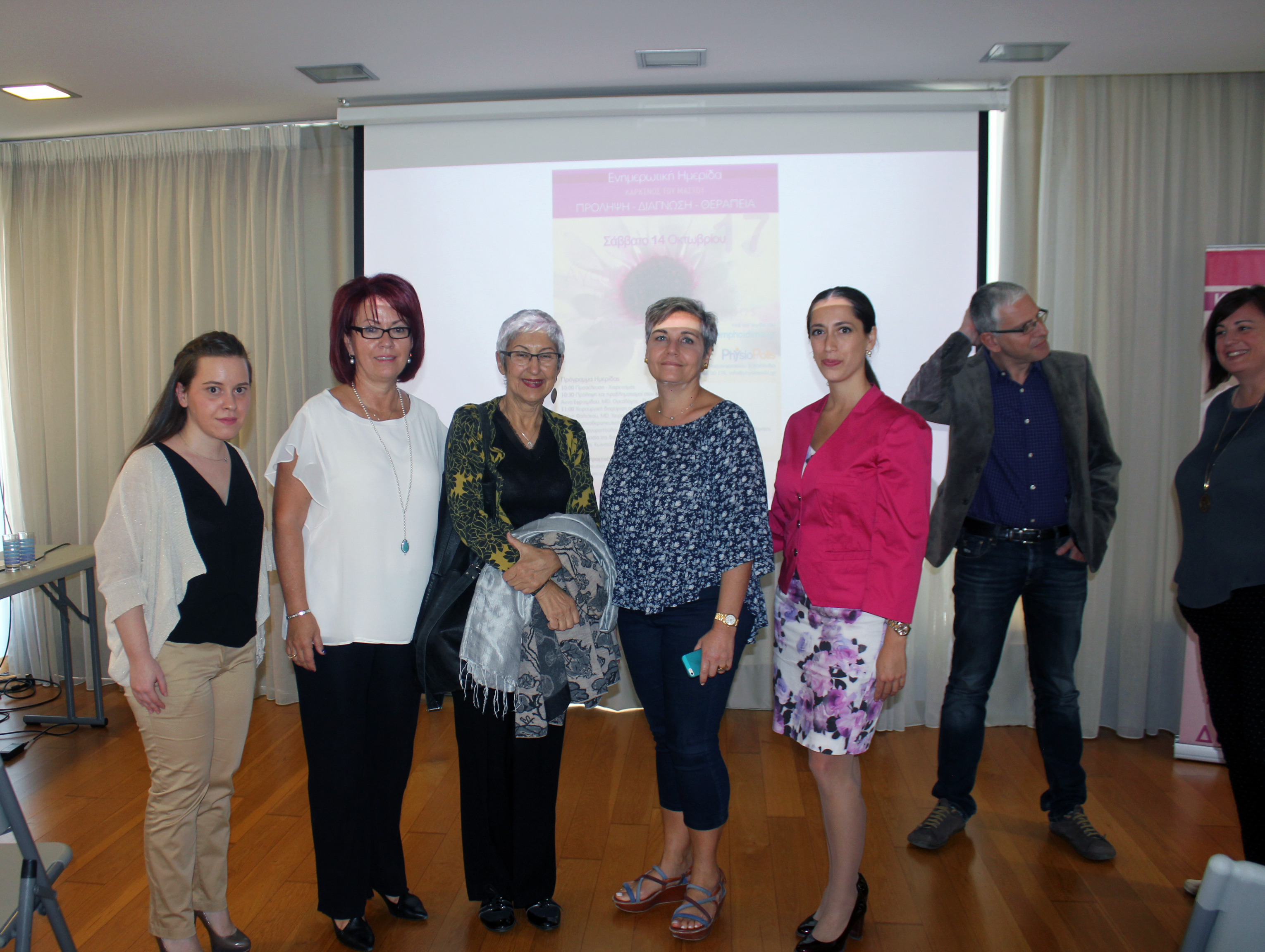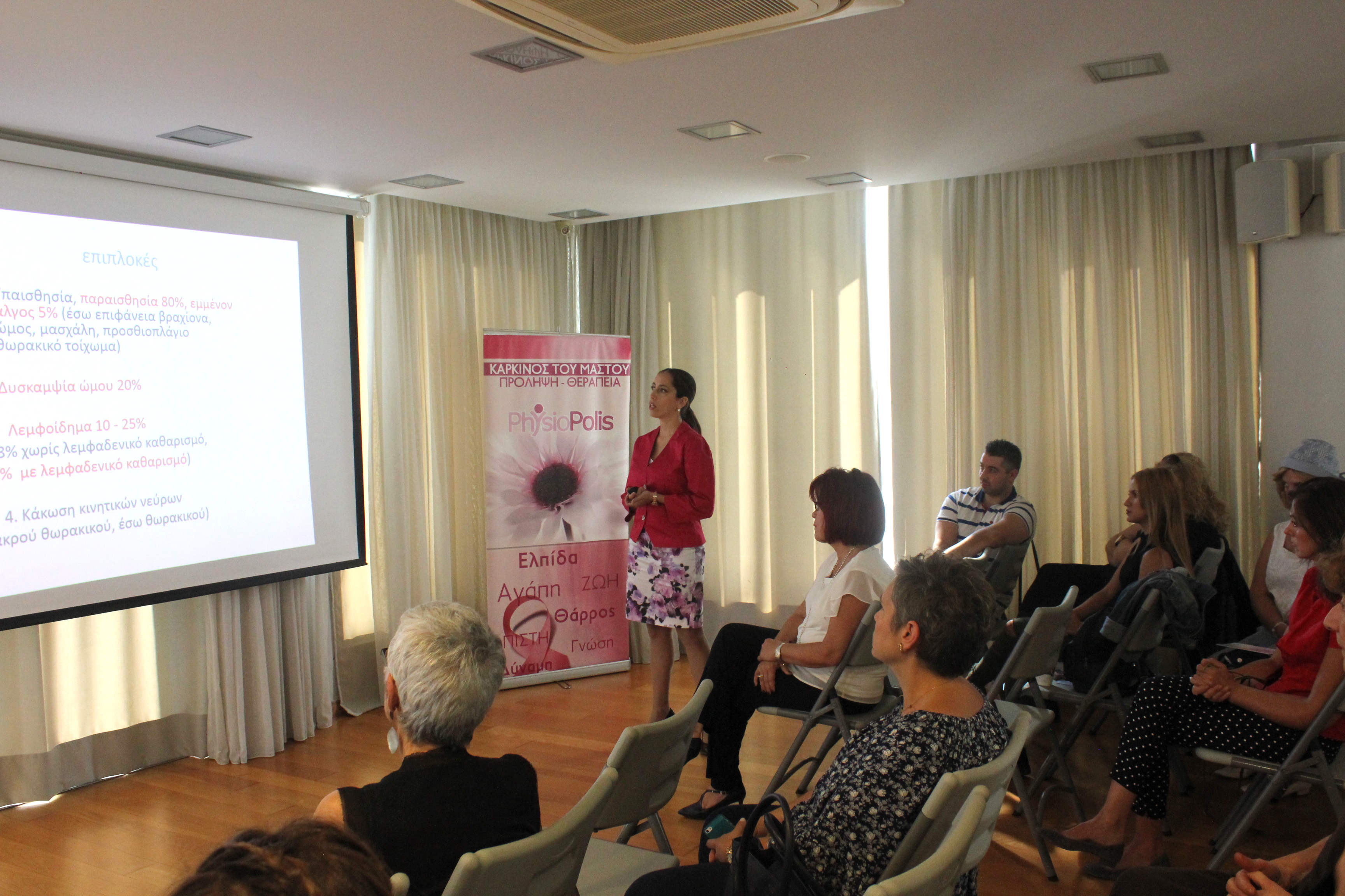 Με επιτυχία πραγματοποιήθηκε η ημερίδα για τον καρκίνο του μαστού, το Σάββατο 14 Οκτωβρίου στο PhysioPolis, στα πλαίσια ενημέρωσης του κοινού. Ευχαριστούμε όσους παρευρέθηκαν και ιδιαιτέρως την κυρία Anna Efremidis, MD, Ογκολόγος-Παθολόγος, την κυρία Eleni Faliakou, MD, Χειρουργός Μαστού, την κυρία Evita Papargyropoulou, Φυσικοθεραπεύτρια, Msc, Πιστοποιημένη Θεραπεύτρια Λεμφοιδήματος, την κυρία Konstantina Exarhopoulou, Msc, Διαιτολόγος-Διατροφολόγος. Όλοι τους συνέβαλαν στη φιλική ατμόσφαιρα συζήτησης και ενημέρωσης που επικράτησε. Αυτό που συγκρατήσαμε και ομόφωνα ειπώθηκε ήταν να ακολουθούμε το ένστικτο μας, να σεβόμαστε το σώμα μας και στις επιθυμίες του και να αγαπάμε και να φροντίζουμε τον εαυτό μας. Ίσως να μην είναι πολύ δύσκολο τελικά, αρκεί να προσπαθήσουμε. Ευχαριστούμε τους: Pharmasept, Biovita και Stathis Zakynthinos για τα δώρα που χάρισαν στους παρευρισκόμενους.